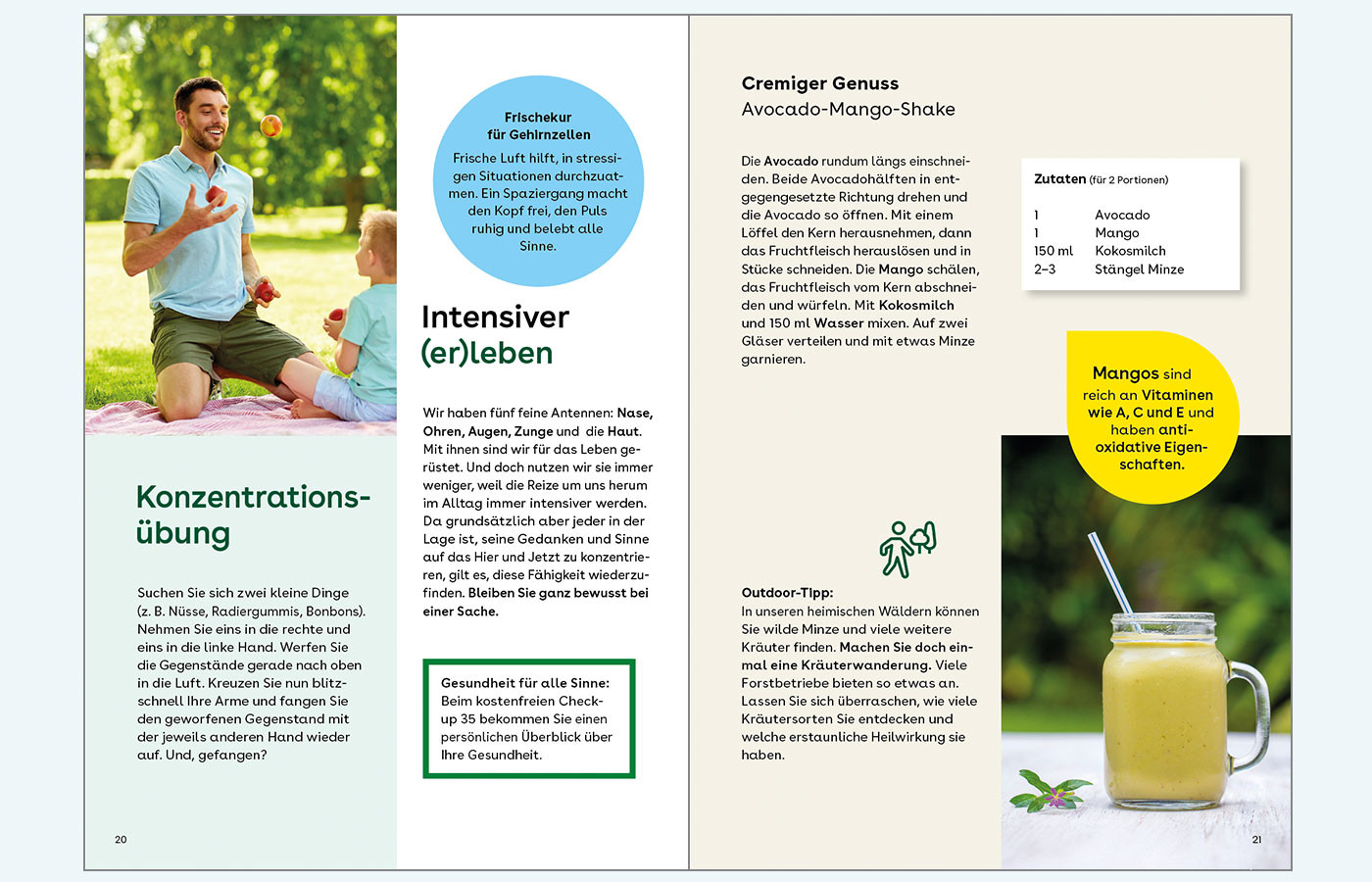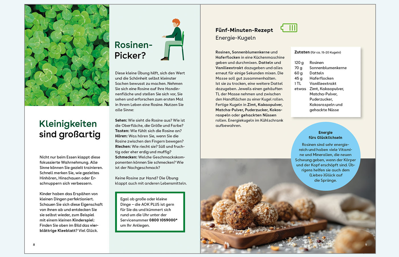 In meiner Rolle als Grafikerin durfte ich das neue Corporate Design der AOK PLUS in diesem Rezeptbuch visuell umsetzen. Dabei arbeitete ich mich in das neue CD ein und nutzte das Brand-Portal mit den hinterlegten Assets wie Logos, Icons, Illustrationen und Bildern. Außerdem griff ich für den Wiedererkennungswert die drei Kampagnenmotive der Gesundheitsinitiative auf und wählte sorgsam passendes Stockmaterial aus.