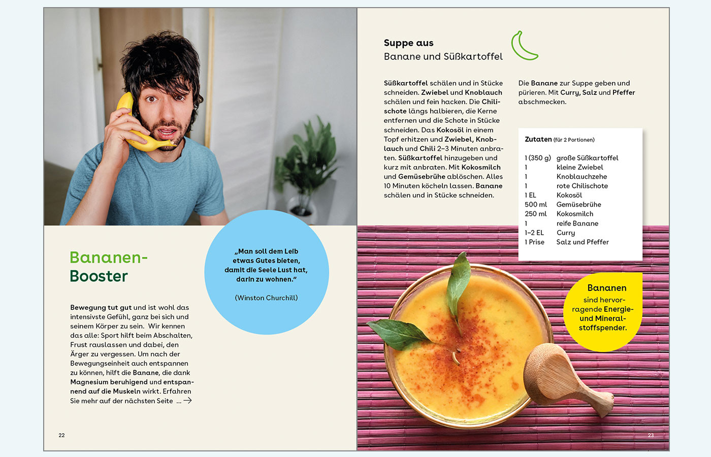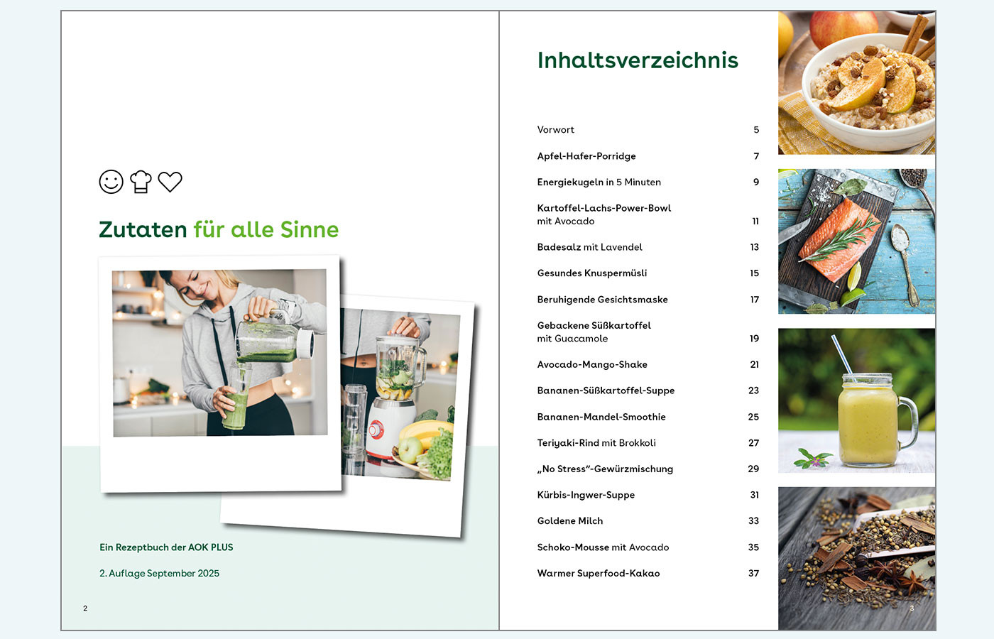 In meiner Rolle als Grafikerin durfte ich das neue Corporate Design der AOK PLUS in diesem Rezeptbuch visuell umsetzen. Dabei arbeitete ich mich in das neue CD ein und nutzte das Brand-Portal mit den hinterlegten Assets wie Logos, Icons, Illustrationen und Bildern. Außerdem griff ich für den Wiedererkennungswert die drei Kampagnenmotive der Gesundheitsinitiative auf und wählte sorgsam passendes Stockmaterial aus.