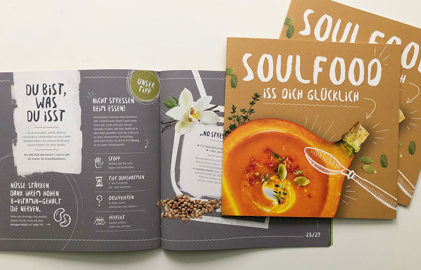 Das exklusives Rezeptbuch „Soulfood – Iss Dich glücklich“ der Gesundheitskasse AOK Nordwest möchte auf dieses Problem aufmerksam machen und setzt sich während seiner Aktionswochen für mehr Achtsamkeit ein.