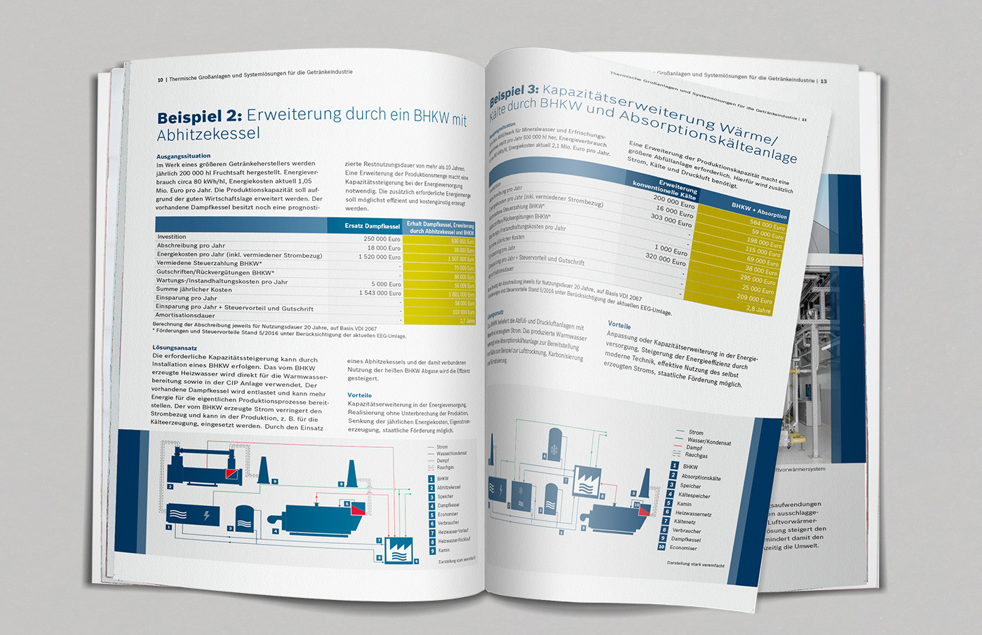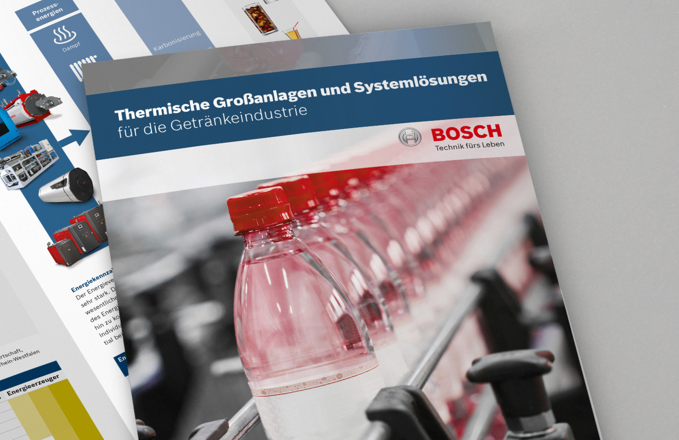 Erstellung einer 16-seitigen BOSCH-Broschur zum Thema “Nachhaltige und kosteneffiziente Lösungen bei der Wärme- und Energieversorgung für die Getränkeindustrie”.