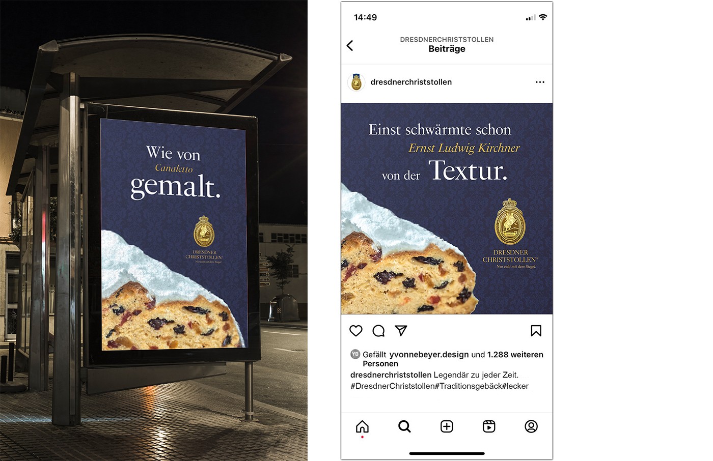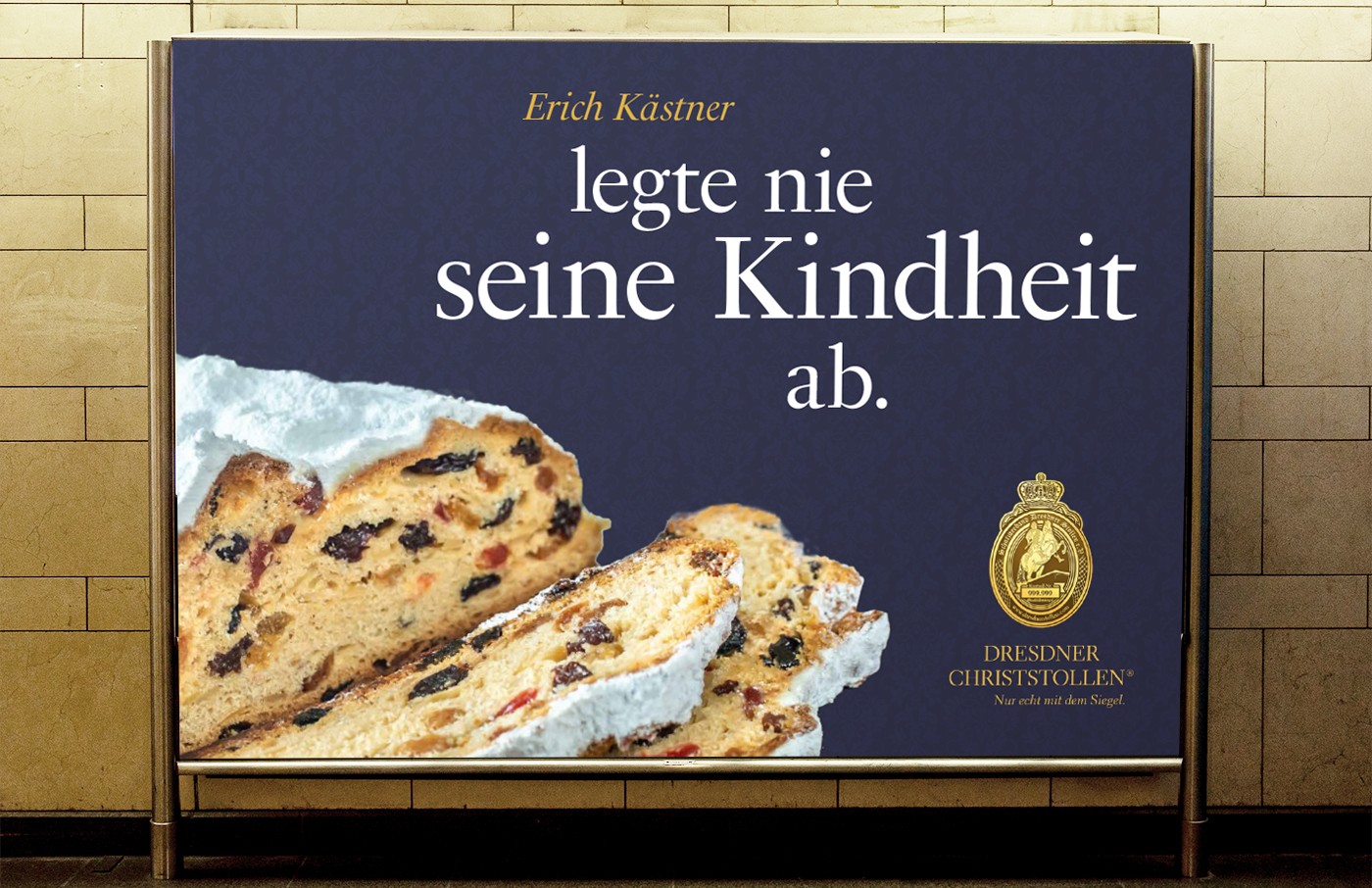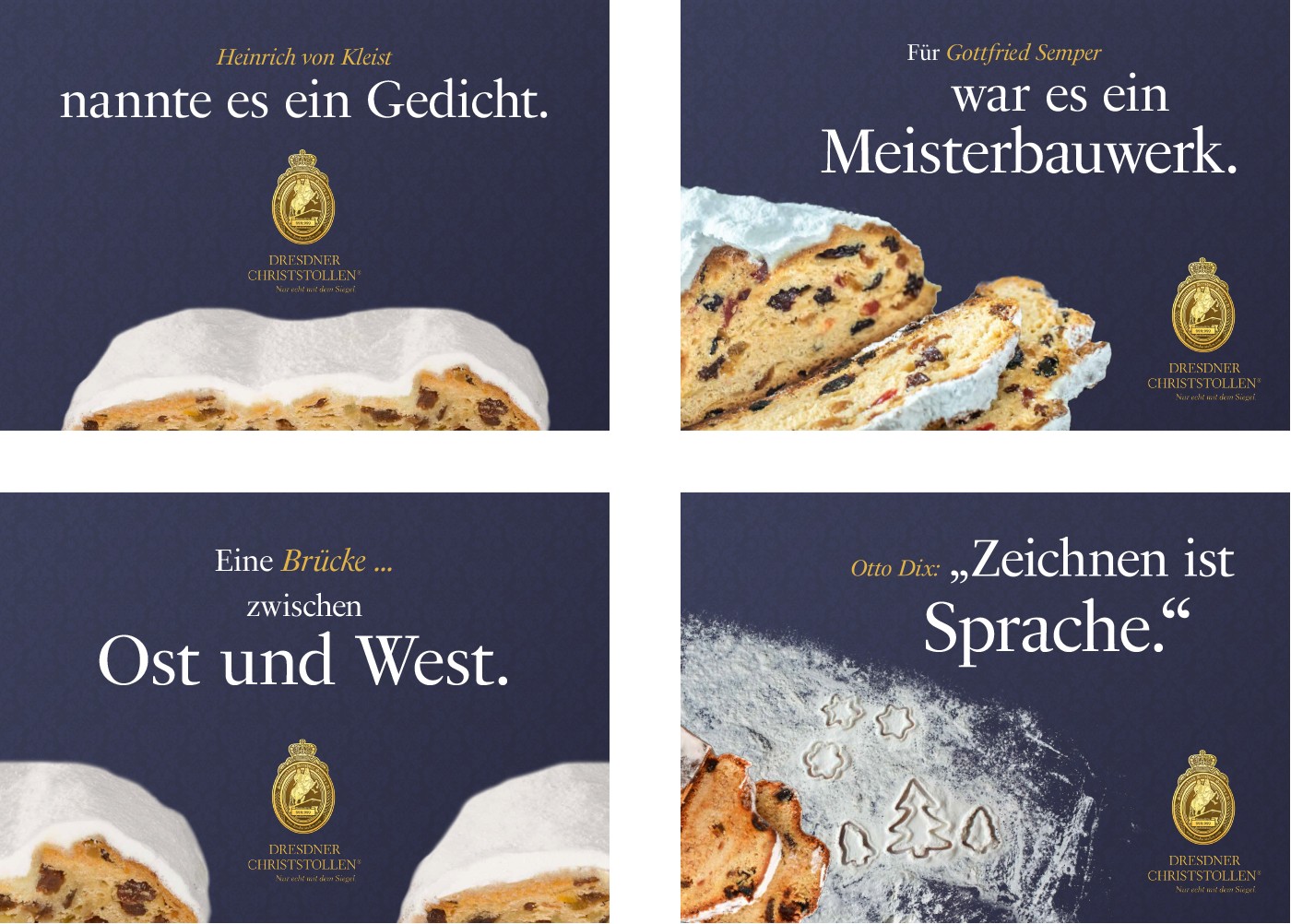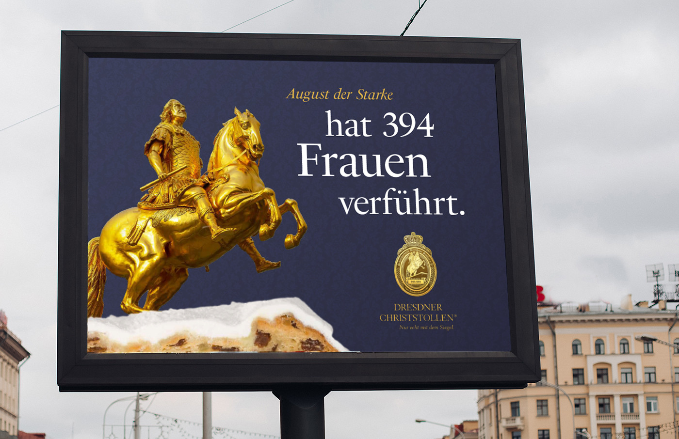 Seit etwa 1474 hat die Geschichte der Dresdner Stollenbäcker Tradition. Um diese Geschichte zu erzählen, sollte ich eine Kampagne im Auftrag der Agentur Dschoy konzipieren, bei der Dresdner Berühmtheiten wie August den Starken, Heinrich von Kleist oder Gottfried Semper in Zusammenhang mit Stollenabbildungen gebracht werden. Die Markenfarben Royalblau im Hintergrund der Motive und das akzentuierte Gold tragen wesentlich zur Wiedererkennung und zum charakteristischen Erscheinungsbild bei. Mit Wortwitz und Augenzwinkern kann sich der Konzeptansatz für die geplante crossmediale Kampagne sehen lassen.