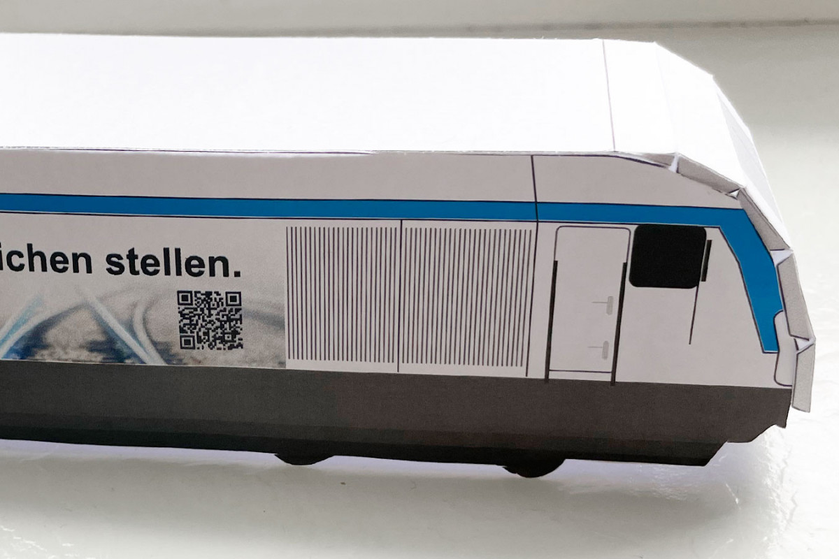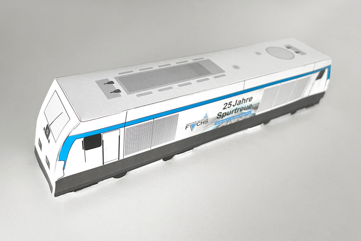 Im Rahmen des Jubiläums durfte ich nicht nur die echte Diesellok gestalten, sondern auch ein ganz besonderes Zusatzprojekt realisieren: einen Bastelbogen im Miniaturformat – als kreative Ergänzung für die Feierlichkeit am neuen Firmensitz in der Voigtstraße.