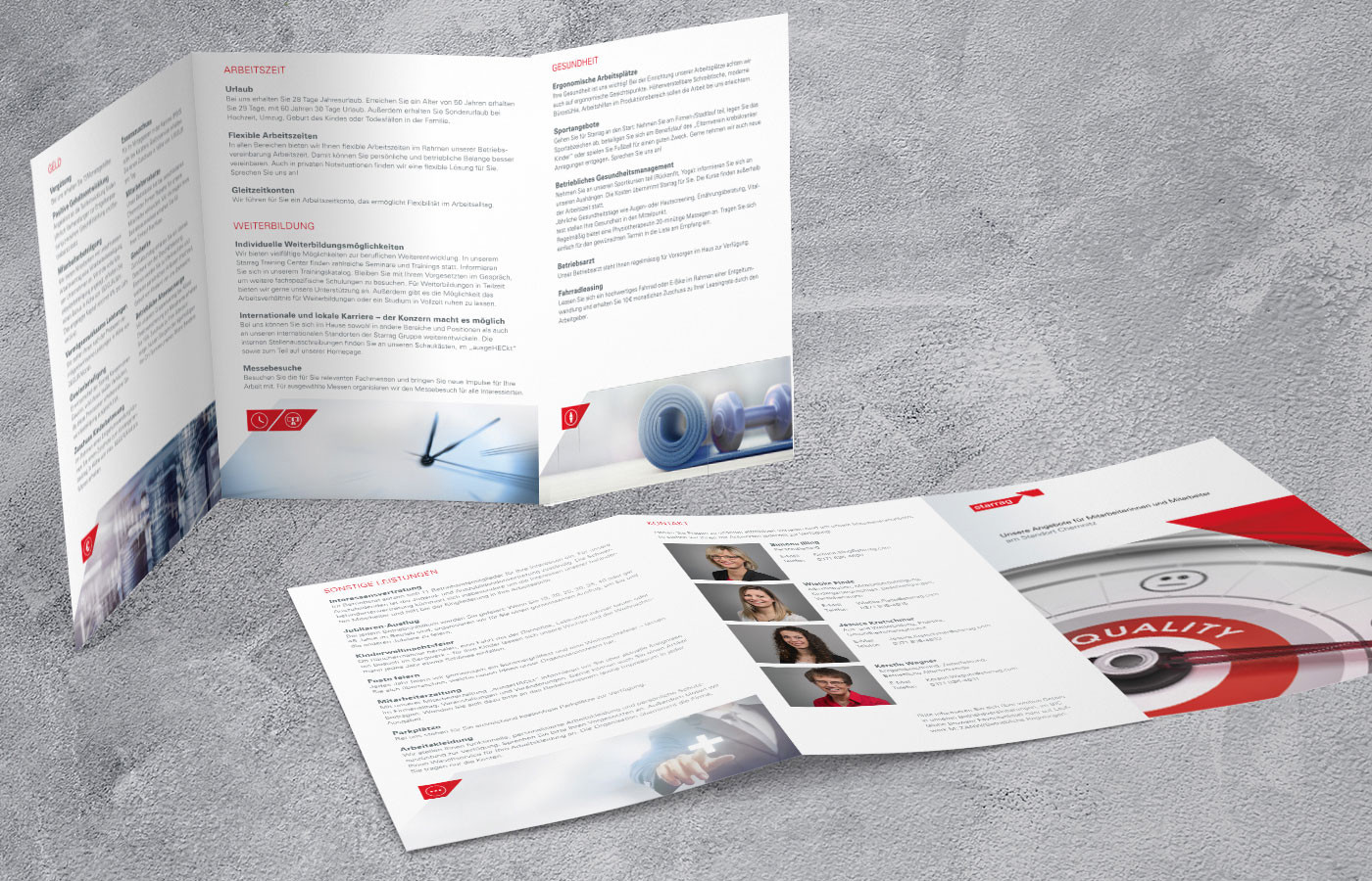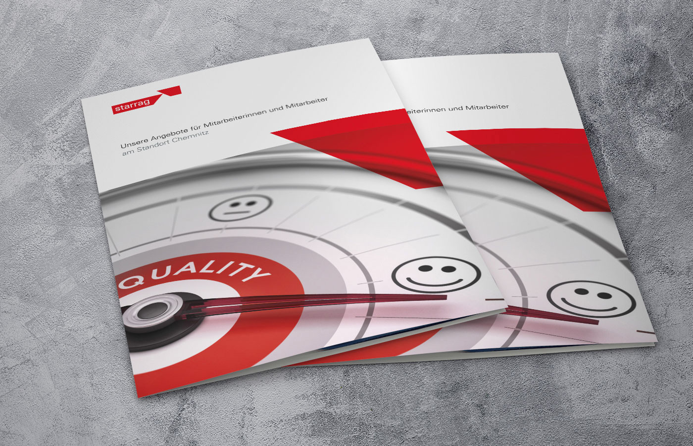 Gute Mitarbeiter zu motivieren und als engagierte Arbeitskräfte zu halten, ist zu einer der schwierigsten strategischen Aufgaben heutiger Führungskräfte geworden. Wer Leistung fordert, muss eine Perspektive bieten. Somit nimmt seit geraumer Zeit die interne Mitarbeiterkommunikation bei starrag einen großen Stellenwert ein. Ein guter Informationsaustausch untereinander und eine zielorientierte Kommunikation zur weiteren Motivation und Bindung der Mitarbeiter steht ganz oben. So entstand ein 6-seitiger Flyer zur internen Kommunikation und zum Austausch wichtiger Informationen. Besondere Angebote, Gesundheitsvorsorge und sonstige Leistungen finden darin Platz.