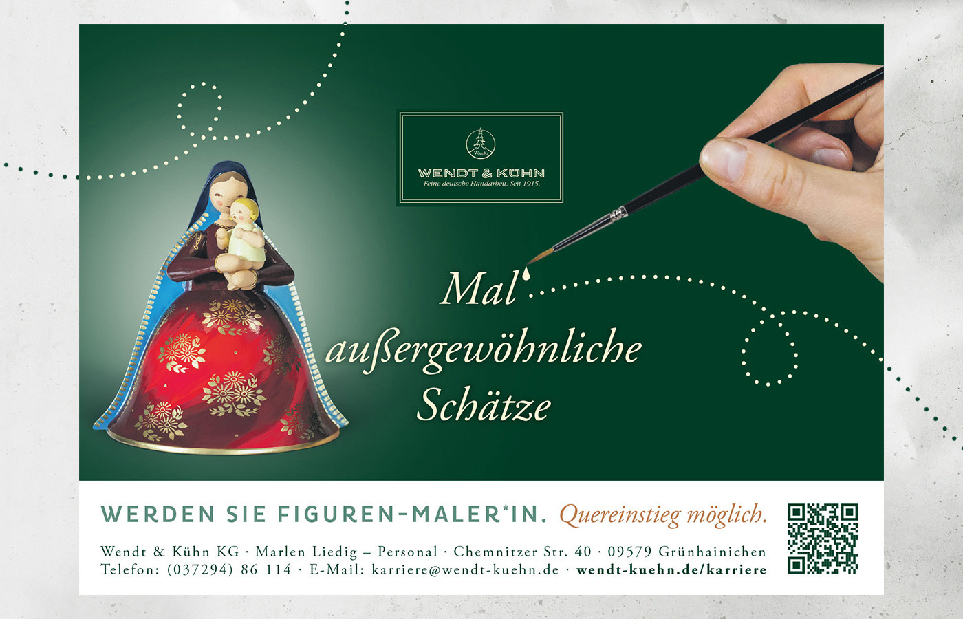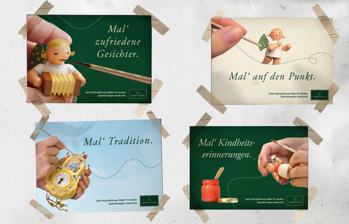 Das Suchen und Finden qualifizierter und passender Kandidaten ist heute oft eine große Herausforderung. Daher bietet sich eine gut durchdachte und geplante Recruiting-Kampagne als befristete Aktion an. YB-Design unterstützte gemeinsam mit der Agentur kopfsatz das Traditionsunternehmen Wendt & Kühn bei der Entwicklung kreativer Entwürfe. So entstand die Kampagne „Mal´Tradition“, die die weltbekannten Figuren in den Mittelpunkt stellt und gezielt den Beruf des Figurenbemalers hervorhebt. Gleichzeitig zeigt sie das traditionelle Handwerk, das viele Menschen mit ihrer Kindheit verbinden.